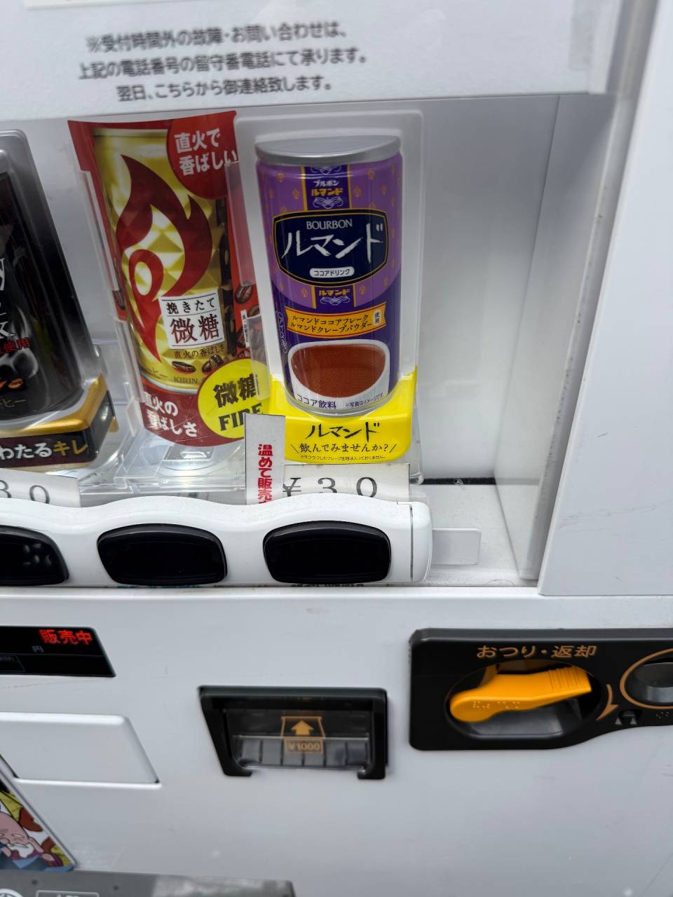 わぉ 大阪 天満 2026/03/06 天満駅付近。リピートのお客さんなので、そこに確か50円の自販機があったように思って、職人に教えようとしたら、80円に上がってました。ただ、炭の方に30円コーナーが。おおって思ってさらによく見ると、ルマンドのドリンク笑。しかも30円。試しに飲んでみましたが、ルマンド、でした笑